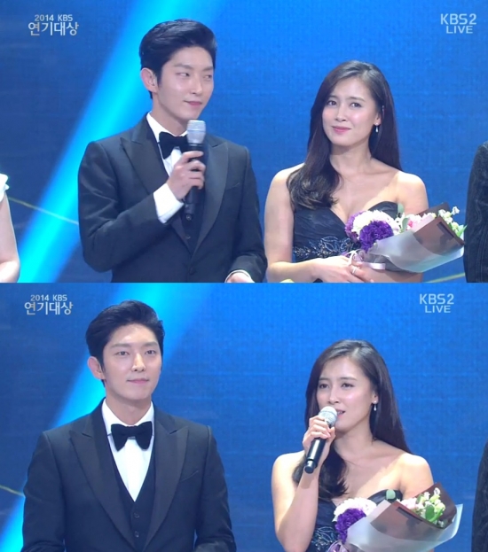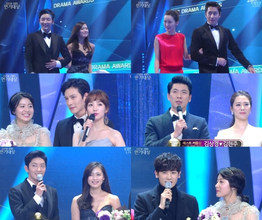 KBS演技大赏的最佳情侣奖共发给了五组情侣,分别是《家族之间何必这样》金贤珠-金尚庆、《朝鲜神枪手》李准基-南相美,《恋爱的发现》Eric-郑由美、《家族之间何必这样》朴炯植-南智贤、《healer》池昌旭-朴敏英。