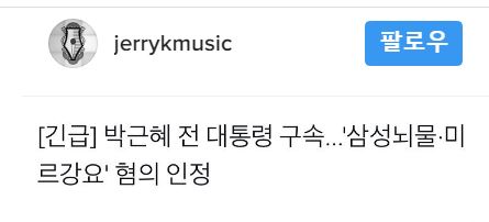 제리케이는 31일 오전 자신의 인스타그램에 '[긴급] 박근혜 전 대통령 구속…'삼성뇌물·미르강요' 혐의 인정'이라는 제목의 기사를 게재하며 "축 구속"이라는 글을 게재했다.