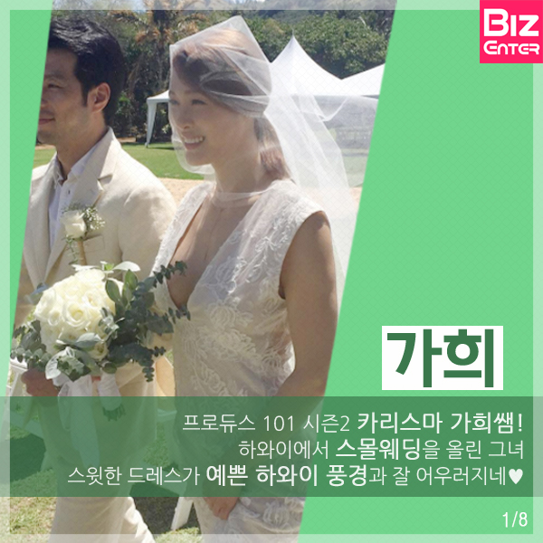 프로듀스 101 시즌2 카리스마 가희쌤! 하와이에서 스몰웨딩을 올린 그녀. 스윗한 드레스가 예쁜 하와이 풍경과 잘 어우러지네♥