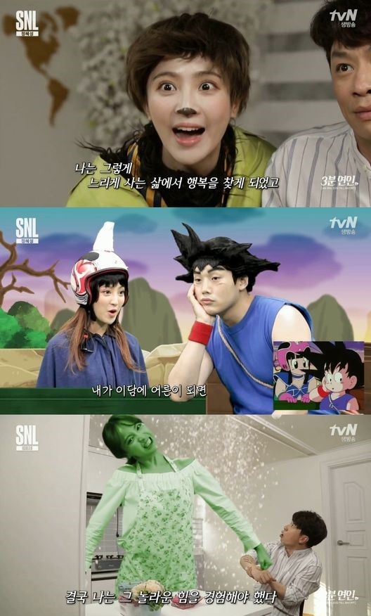 ‘더빙극장’에서는 애니메이션 '드래곤볼'에 도전했다. 권혁수는 손오공을 비롯해 무천도사 등을 패러디했다. 정혜성은 치치 분장으로 깜찍함을 더했다. 두 사람은 이 외에도 여러 캐릭터를 소화하며 '더빙극장'의 묘미를 제대로 살렸다.