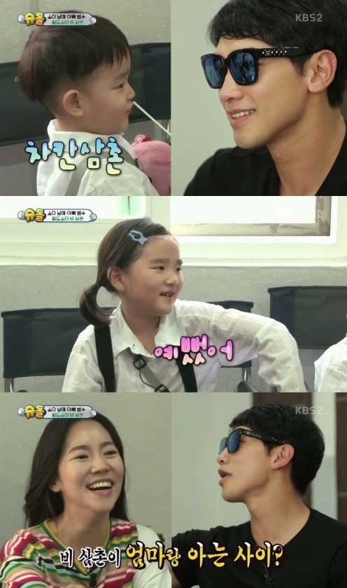 비는 소담남매에게 "저번에 김태희 봤지? 삼촌이랑 결혼했어"라며 "삼촌은 소을이처럼 예쁜 여자아이를 낳고 싶다"고 말해 눈길을 끌었다. 소을이가 "여자 두 명은 안 돼요. 장난감 가지고 싸운다"고 하자 "그럼 두 개 사주면 되지"라고 답해 웃음을 자아냈다.