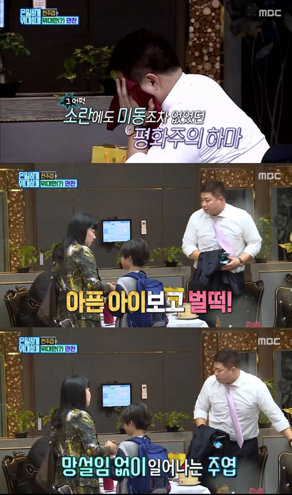어떤 소란에도 움직이지 않던 현주엽은 아이의 모습을 보자마자 자리에서 벌떡 일어났다. 망설임없는 모습에 김태우도 놀란 눈치였다. 평화주의를 유지하려 애썼지만 아이 앞에서는 아빠마음일 수밖에 없었던 것. 이어 "저랑 병원을 다녀오자"며 적극적인 모습을 보였다.