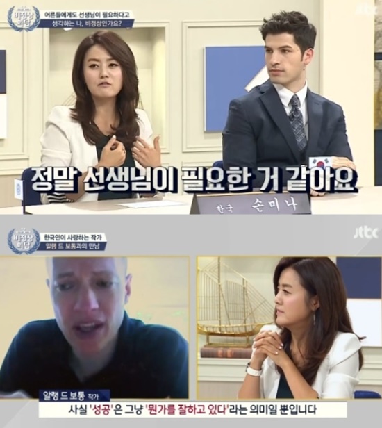 최근 어른들을 위한 학교인 인생학교를 설립한 손미나는 방황하는 어른들을 위한 수업과 자신이 만났던 인상 깊은 학생들을 소개했다. 그러던 중 ‘인생학교’ 프로젝트의 창시자이자 세계적인 작가 알랭 드 보통과 깜짝 전화연결을 해 눈길을 끌었다.