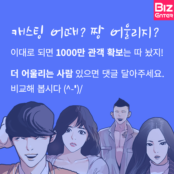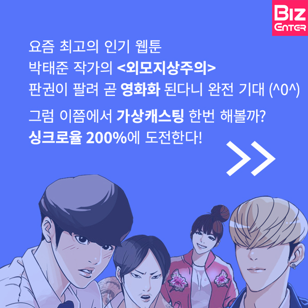 요즘 최고의 인기 웹툰 박태준 작가의 <외모지상주의> 판권이 팔려 곧 영화화 된다니 완전 기대 (^0^) 그럼 이쯤에서 가상캐스팅 한번 해볼까? 싱크로율 200%에 도전한다!