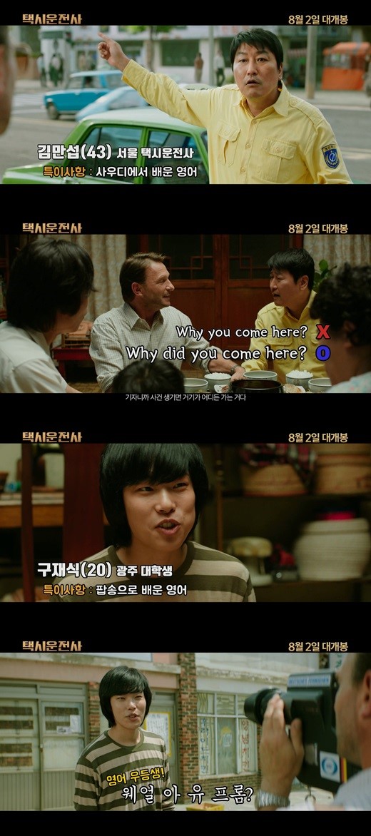 이러한 두 배우의 소통 방법의 차이는 영화 속에서도 이어졌다. 함께 공개된 만섭 VS 재식 잉글리쉬 비교 영상에서 서울 택시운전사 만섭은 사우디 건설 현장에서 익힌 짧은 영어 실력과 자신감 넘치는 모습으로 생활형 영어를 구사하며 피터와 대화를 이어나간다. "나랑 투게더~? 렛츠 고 광주!"와 같이 아는 단어와 한국어를 섞어 말하는 만섭과 이러한 그의 콩글리쉬를 알아듣는 피터의 모습은 극중 두 사람이 보여줄 끈끈한 케미를 기대하게 만든다.