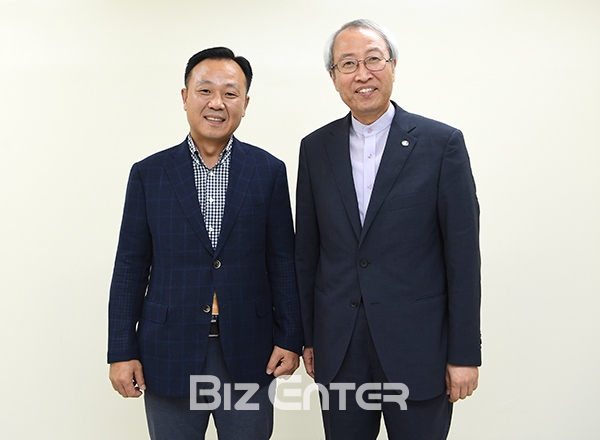 '2017 에너지 나눔 콘서트'의 성공 개최를 위해 후원사 비즈엔터 전중연 대표(왼쪽)와 밀알복지재단 정형석 상임대표가 26일 서울 송파구 방이동 올림픽공원 SK핸드볼 경기장에서 밝게 미소짓고 있다.