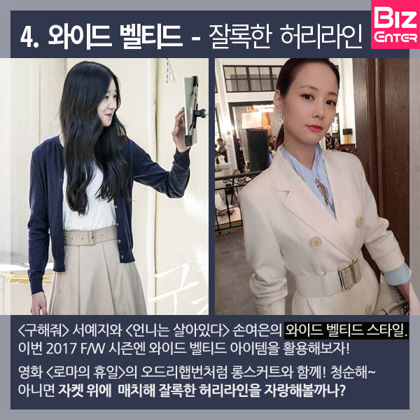 <구해줘> 서예지와 <언니는 살아있다> 손여은의 와이드 벨티드 스타일. 이번 2017 F/W 시즌엔 와이드 벨티드 아이템을 활용해보자! 영화 <로마의 휴일>의 오드리햅번처럼 롱스커트와 함께! 청순해~ 아니면 자켓 위에 매치해 잘록한 허리라인을 자랑해볼까나?