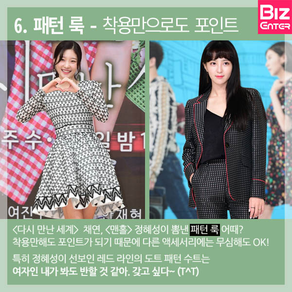 <다시 만난 세계> 채연, <맨홀> 정혜성이 뽐낸 패턴 룩 어때? 착용만해도 포인트가 되기 때문에 다른 액세서리에는 무심해도 OK! 특히 정혜성이 선보인 레드 라인의 도트 패턴 수트는 여자인 내가 봐도 반할 것 같아. 갖고 싶다~(T^T)