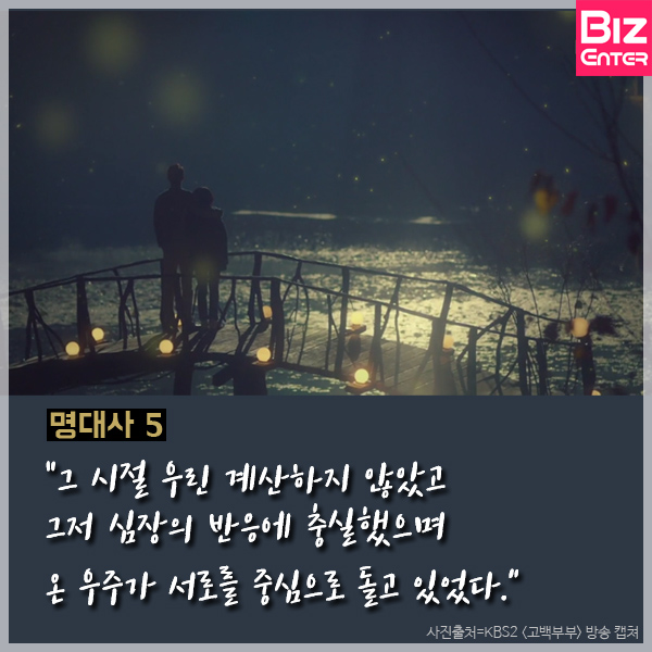 명대사 5 그 시절 우린 계산하지 않았고 그저 심장의 반응에 충실했으며 온 우주가 서로를 중심으로 돌고 있었다.