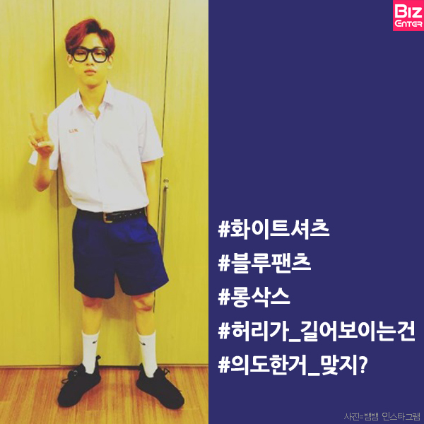 1. 화이트셔츠, 블루팬츠, 롱삭스, 허리가 길어보이는 건 의도한거 맞지?