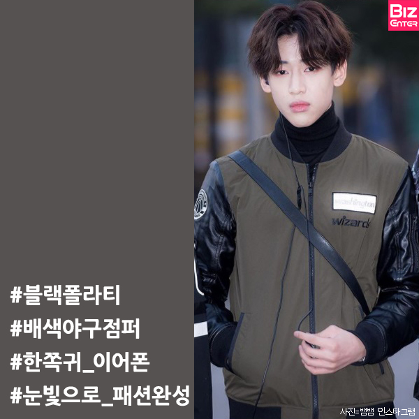 5. 블랙 폴라티, 배색 야구점퍼, 한쪽 귀 이어폰, 눈빛으로 패션 완성