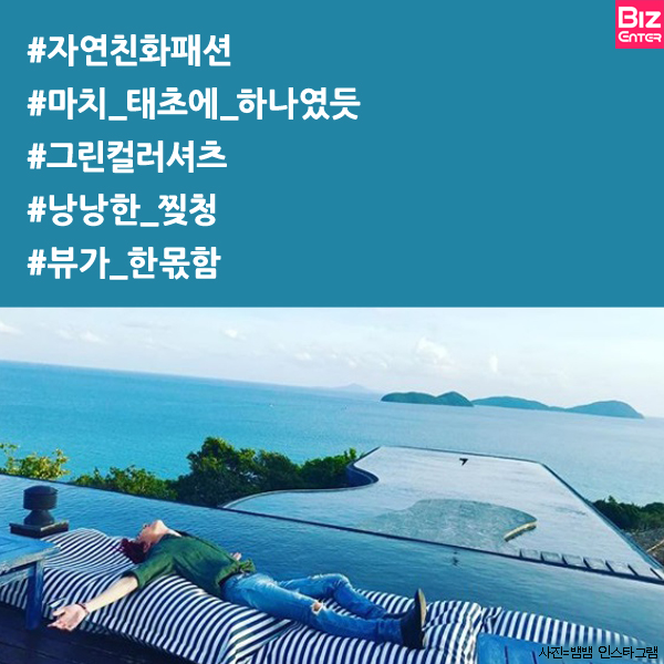 8. 자연친화패션, 마치 태초에 하나였듯, 그린 컬러셔츠, 낭낭한 찢청, 뷰가 한 몫함