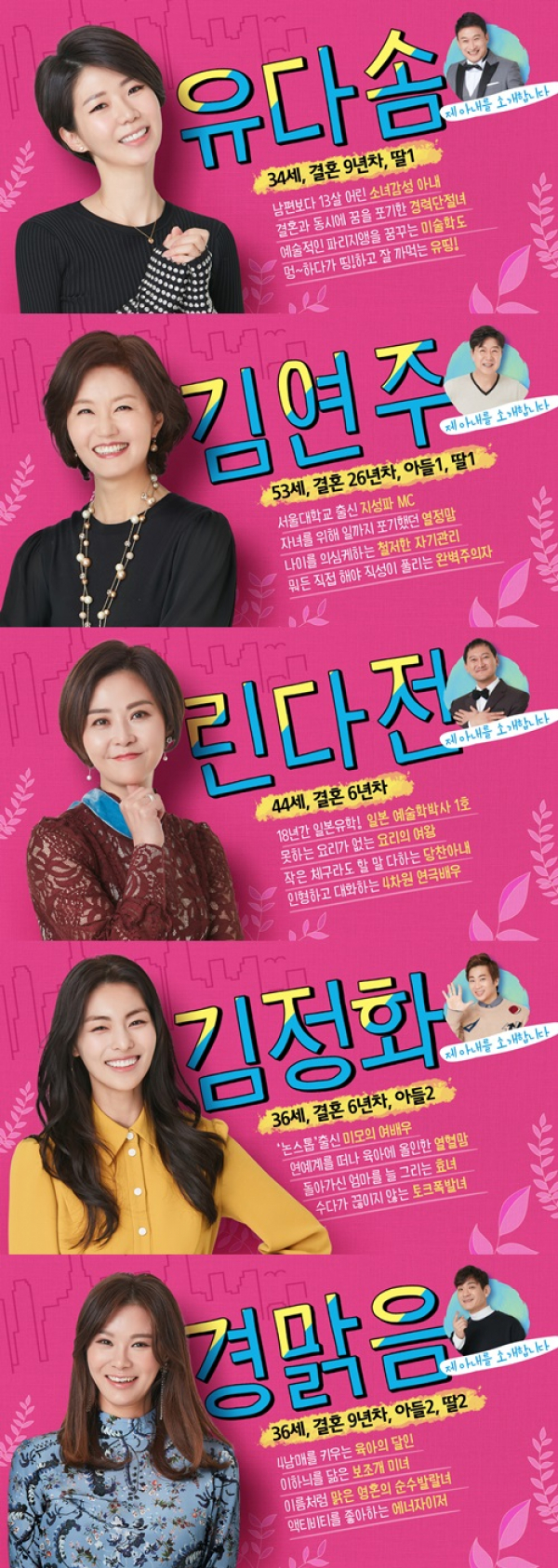 새로운 다섯 아내들의 라인업도 돋보인다. 방송에 최초로 등장하는 서경석 아내와 정만식 아내부터 반가운 얼굴들도 여럿 출연해 재미를 더할 전망이다.