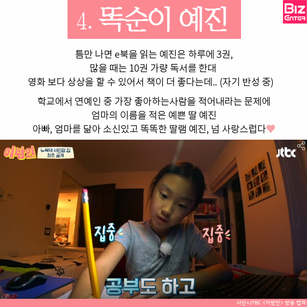 틈만 나면 e북을 읽는 예진은 하루에 3권, 많을 때는 10권 가량 독서를 한대 영화 보다 상상을 할 수 있어서 책이 더 좋다는데.. (자기 반성 중) 학교에서 연예인 중 가장 좋아하는사람을 적어내라는 문제에 엄마의 이름을 적은 예쁜 딸 예진 아빠, 엄마를 닮아 소신있고 똑똑한 딸램 예진, 넘 사랑스럽다♥
