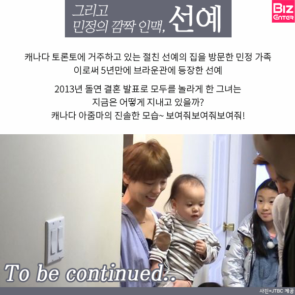 캐나다 토론토에 거주하고 있는 절친 선예의 집을 방문한 민정 가족 이로써 5년만에 브라운관에 등장한 선예 2013년 돌연 결혼 발표로 모두를 놀라게 한 그녀는 지금은 어떻게 지내고 있을까? 캐나다 아줌마의 진솔한 모습~ 보여줘보여줘보여줘!