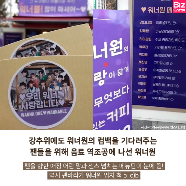 강추위에도 워너원의 컴백을 기다려주는 팬들을 위해 음료 역조공에 나선 워너원. 팬을 향한 애정 어린 맘과 센스 넘치는 메뉴판이 눈에 띔! 역시 팬바라기 워너원 엄지 척 o_o)b