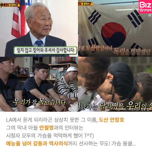 LA에서 듣게 되리라곤 상상치 못한 그 이름, 도산 안창호. 그의 막내 아들 안필영과의 인터뷰는 시청자 모두의 가슴을 먹먹하게 했어. 예능을 넘어 감동과 역사의식까지 선사하는 무도! 가슴 뭉클...