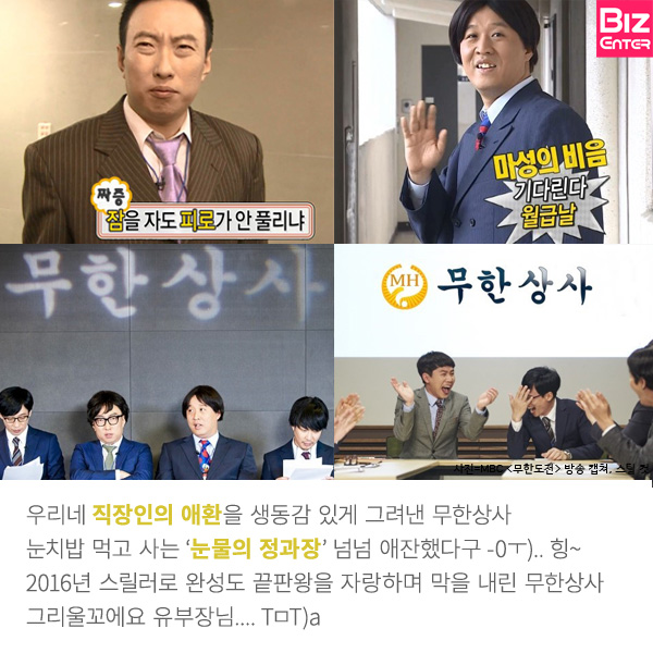 우리네 직장인의 애환을 생동감 있게 그려낸 무한상사. 눈치밥 먹고 사는 '눈물의 정과장' 넘넘 애잔했다구 힝.. 2016년 스릴러로 완성도 끝판왕을 자랑하며 막을 내린 무한상사. 그리울꼬에요 유부장님...