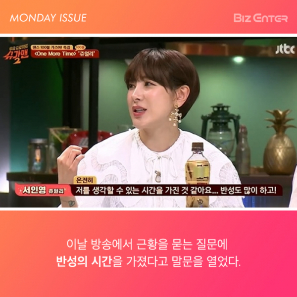 이날 방송에서 서인영은 "얘기를 안 하고 슥 넘어가자니 조금 민망하다. 여러가지 일이 있지 않았나. 온전히 나를 생각할 수 있는 시간을 가졌다. 반성도 많이 했다"고 말했다. 이어 "'죄송합니다'라는 한 마디를 하고 싶다. 그 말을 그동안 못 했다. 모든 분들께 진심으로 죄송하다"며 울먹였다.