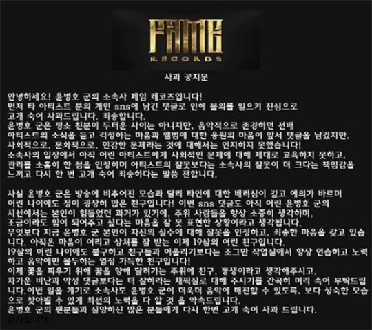 윤병호 소속사 페임 레코즈의 공식입장