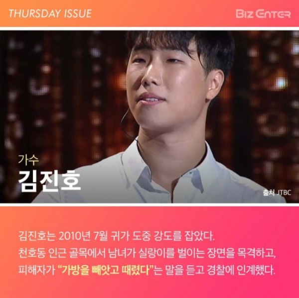 김진호는 2010년 7월 서울시 강동구 천호동에서 남녀가 실랑이를 벌이는 장면을 목격했다. 이 때 피해자는 "어떤 남자가 갑자기 가방을 빼앗고 때렸다"고 말했고, 김진호는 친구들과 달려가 택시를 타려던 남성을 제압했다.