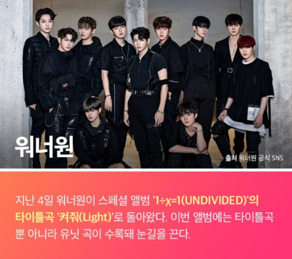 워너원은 4일 스페셜 앨범 '1÷χ=1(UNDIVIDED)'를 발표, 타이틀곡 '켜줘'와 동시에 4곡의 유닛 음원을 발표했다. 엠넷 '워너원 고'를 통해 유닛들의 작업기도 공개됐다. 강다니엘-김재환-박우진(트리플 포지션), 황민현-윤지성-하성운(린온미), 박지훈-배진영-라이관린(남바완), 이대휘-옹성우(더힐)로 나눠진 11명의 멤버들은 각각 지코, 넬, 다이나믹듀오, 헤이즈와 뭉쳐 유닛곡을 발표했다.