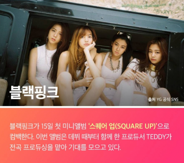 블랙핑크가 15일 첫 미니앨범 '스퀘어 업(SQURE UP)'을 발표한다. 이번 신보 '스퀘어 업'은 블랙핑크가 데뷔부터 진행해온 'SQUARE' 시리즈로, 데뷔앨범 'SQUARE ONE', 두 번째 앨범 'SQUARE TWO'의 연장이다. 이번 '스퀘어업'은 '붙어보자' '싸워보자'라는 뜻으로, '당당하게 맞서자'라는 의미를 담고있다.