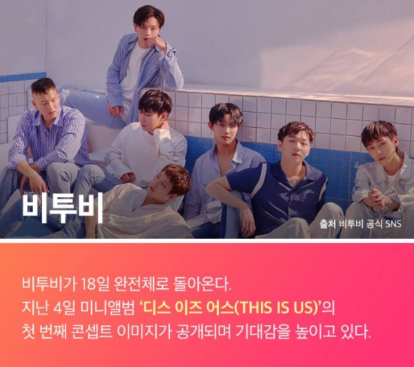 비투비도 18일 열한 번째 미니앨범 'THIS IS US'로 컴백한다. 이와 함께 비투비는 섹시하고 몽환적인 콘셉트 이미지를 공개했다. 개인별과 단체 사진 등 총 8장에는 멤버들의 몽환적이면서도 섹시한 느낌이 묻어나 있다.