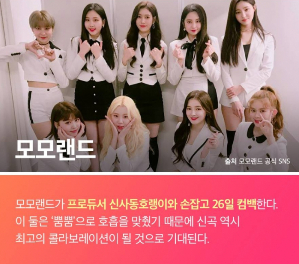 모모랜드는 프로듀서 신사동 호랭이와 손잡고 26일 컴백한다. 소속사 더블킥컴퍼니는 "신나는 댄스음악이다. 모모랜드와 신사동호랭이는 '뿜뿜'으로 좋은 호흡을 맞췄기 때문에 이번 역시 최고의 컬래버레이션이 될 것으로 기대한다"고 전했다.
