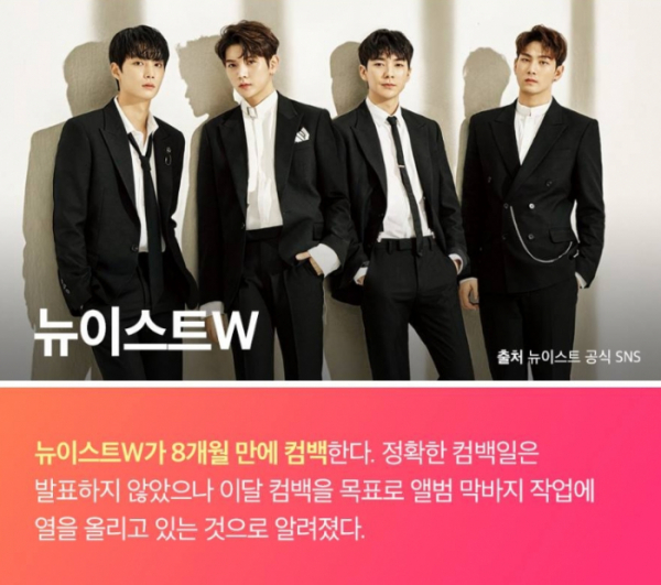뉴이스트 W(JR, 아론, 백호, 렌)도 25일 가요계에 컴백한다. 뉴이스트 W는 7일 자정 공식 팬카페를 통해 새 앨범 발매와 컴백 소감을 손편지로 전했다. 뉴이스트 W는 오랫동안 기다려준 팬들에게 감사의 인사를 전하며, 활동 준비에 박차를 가하고 있다.