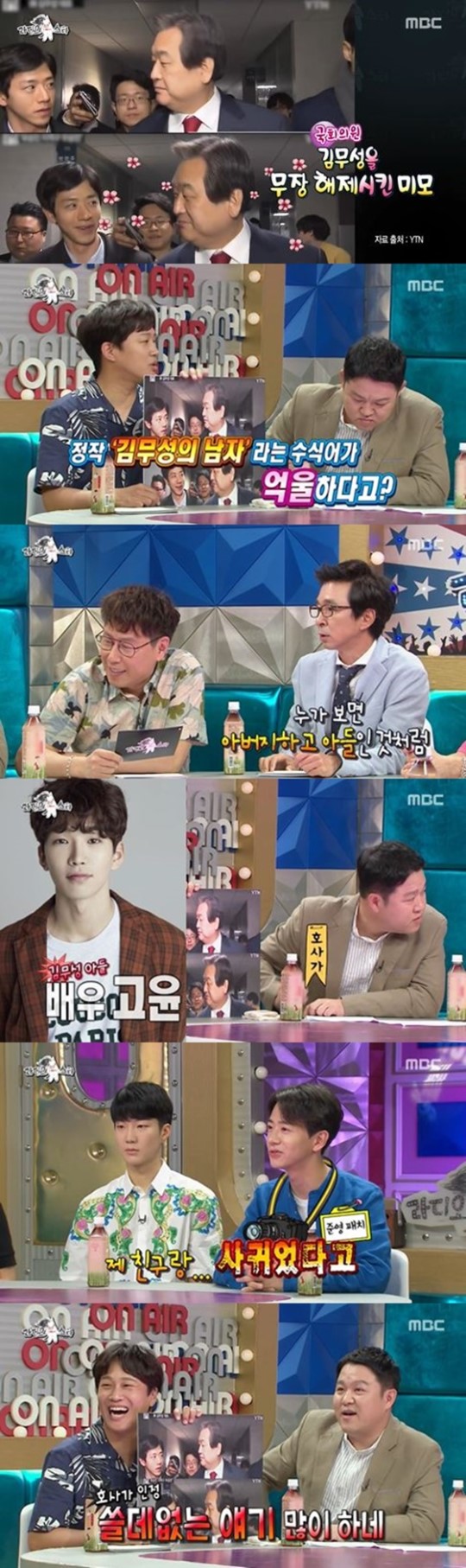 이날 김무성 의원과 전준영PD의 사진을 보던 김국진은 "누가 보면 아들과 아버지인줄 알겠다"라고 말했다. 이에 김구라는 "마침 김무성 의원의 아들이 배우를 하고 있지 않나"라고 배우 고윤을 언급헀다.