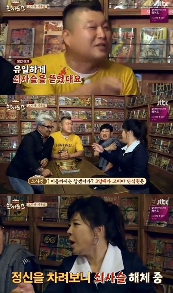 이날 강호동은 "노사연이 체중 조절을 위해 단식원을 찾았는데 유일하게 냉장고 쇠사슬을 뜯었다고 하더라"고 폭로했다.