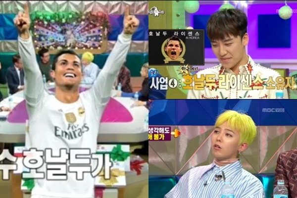 빅뱅 멤버 지드래곤과 탑, 태양, 대성, 승리는 2016년 MBC '라디오스타'에 출연했다. 이날 지드래곤은 "제가 알고 있는 승리의 라이센스 중 제일 말이 안 되는 것은 '축구선수 호날두가 한국에서 모든 일을 할 때 승리가 매니지먼트 및 마케팅을 담당한다'는 것인데"라고 운을 뗐다.