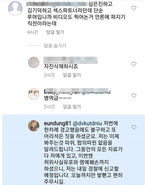 심은진은 10일 자신의 SNS에 악플러가 남긴 댓글을 캡처해 올렸다. 댓글에는 "김X덕 감독과 심은진이 부적절한 관계다. 그리고 이들이 촬영한 비디오가 언론을 통해 퍼지기 직전"이라고 게재되어 있다.