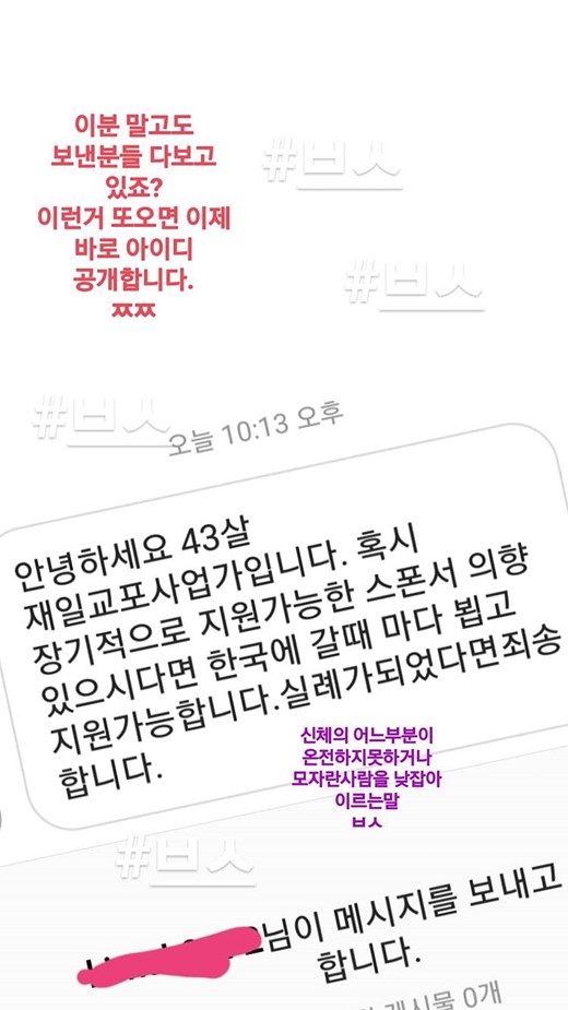 공개된 사진에는 사업가라고 주장하는 한 남성의 메시지가 담겨 있다. 그는 "안녕하세요. 43살 재일교포 사업가입니다. 혹시 장기적으로 지원 가능한 스폰서 의향 있으시다면 한국에 갈 때마다 뵙고 지원 가능합니다. 실례가 되었다면 죄송합니다"라는 충격적인 스폰서 제의 내용이 담겨 있다.