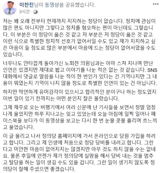 이와 함께 이찬진은 노회잔 의원의 '6411번 버스를 아십니까' 동영상을 링크했다. 이찬진은 "이 글 올리고 나서 정의당 홈페이지에 가서 온라인으로 당원 가입을 하려 한다"며 "제 인생에 처음으로 정당 당비를 내려고 한다"고 썼다. 그러면서 "그런다고 미안한 마음이 없어지지는 않겠지만 아무 것도 하지 않을 수는 없다. 물론 후일 언젠가 정의당에 실망해 당비 내는 것을 멈추고 탈당할 수도 있다. 그런 일이 생기지 않도록 정의당이 잘해주셨으면 좋겠다"고 글을 마무리했다.