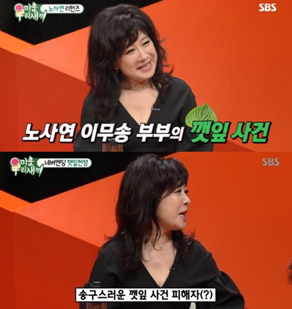이외에도 노사연은 '깻잎 대첩'에 대해 언급했다. 깻잎대첩은 노사연의 남편 이무송이 지인들과 식사 자리에서 다른 여자가 깻잎을 집으려고 하자 깻잎은 잡아준 것을 두고 서운하다고 토로한 바 있다.