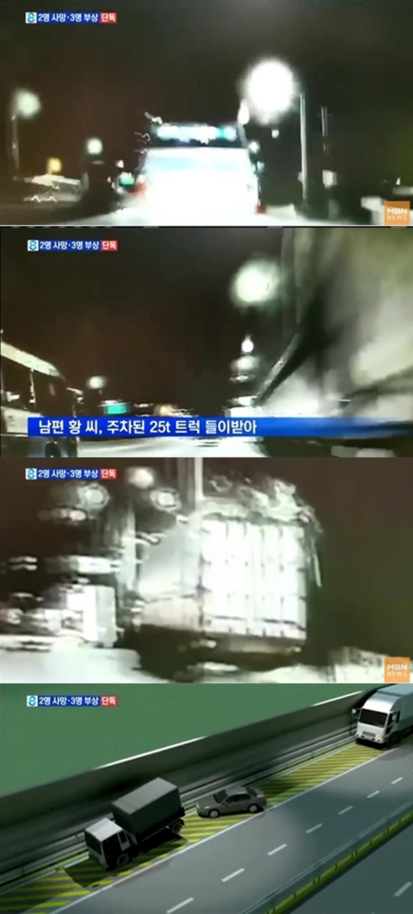 28일 방송된 MBN '뉴스8'에서는 27일 밤 경기도 구리시 강변북로 남양주 방향 토평나들목 인근 갓길에 정차 중이던 25톤 화물차를 들이받은 황민의 차량 내부 블랙박스 영상을 공개했다.