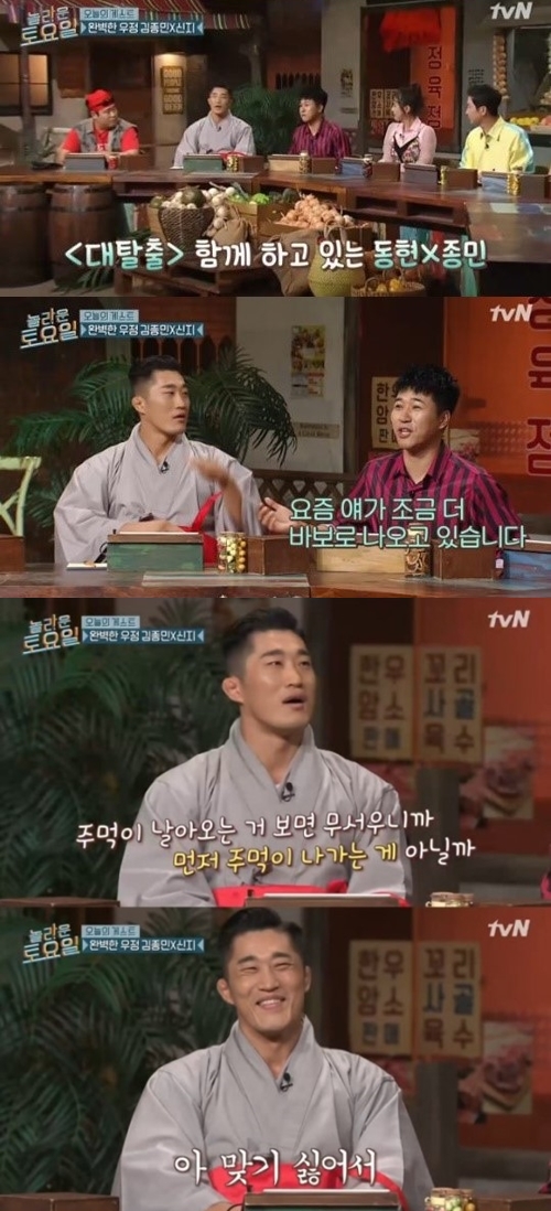 김종민은 "김동현이 생각보다 겁이 많더라. 무서운 게 있으면 계속 뒤에 가더라"라며 김동현이 종합격투기 선수 모습과는 반전의 모습을 전했다. 이어 "이종격투기 선수가 된 이유를 알겠다. 주먹이 날아오는 거 무서우니까 먼저 주먹을 내미는 거다"라고 말했다. 이에 김동현은 "맞다"라고 말해 웃음을 자아냈다.