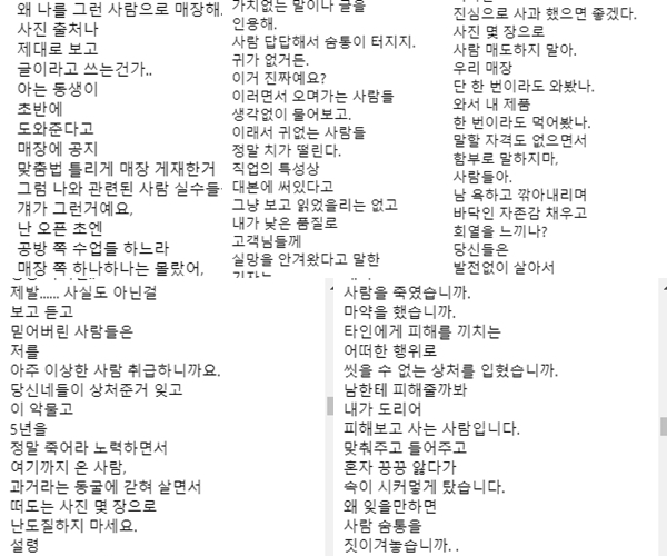 사진 몇 장으로 사람 매도하지 말았으면, 우리 매장 단 한 번이라도 와봤나. 와서 내 제품 한 번이라도 먹어봤나. 말할 자격도 없으면서 함부로 말하지 마, 사람들아. 남 욕하고 깎아내리며 바닥인 자존감 채우고 희열을 느끼나? 당신들은 발전 없이 살아서 평생 미숙한 채로 남아있나? 사실 확인이나 똑바로 하고 글 쓰고, 방송하시길. 제발. 사실도 아닌 걸 보고 듣고 믿어버린 사람들은 저를 아주 이상한 사람 취급하니까요. 당신네들이 상처를 준 거 잊고 이 악물고 5년을 정말 죽으라고 노력하면서 여기까지 온 사람, 과거라는 동굴에 갇혀 살면서 떠도는 사진 몇 장으로 난도질하지 마세요. 설령 그 말도 안 되는 모든 것들이 죄다 내 실수라쳐도 당신들 살면서 실수 단 한 번도 안하고 완벽하게 삽니까? 내가 사람을 죽였습니까. 마약을 했습니까. 타인에게 손해를 끼치는 어떠한 행위로 씻을 수 없는 상을 입혔습니까. 남한테 피해 줄까 봐 내가 도리어 피해를 보고 사는 사람입니다. 맞춰주고 들어주고 혼자 끙끙 앓다가 속이 시커멓게 탔습니다. 왜 잊을만하면 사람 숨통을 짓이겨놓습니까. 정말 내가 죽어 없어져야 그 가벼운 입들로 더러운 손들로사람 하나 병신 만들고 끝낼 겁니까?