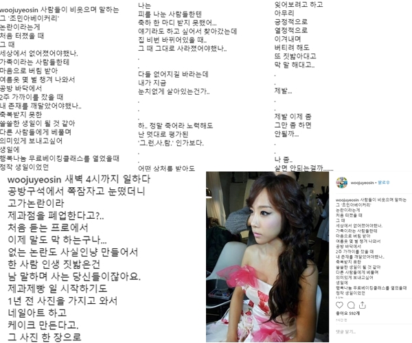 더불어 "어떤 상처를 받아도 잊어보려고 하고 아무리 긍정적으로 열정적으로 이겨내며 버티려 해도 또 짓밟아대고 막 말 해대고. 제발 이제 좀 그만 좀 하면 안될까"란 말로 고통스러운 심경을 내비쳤다.