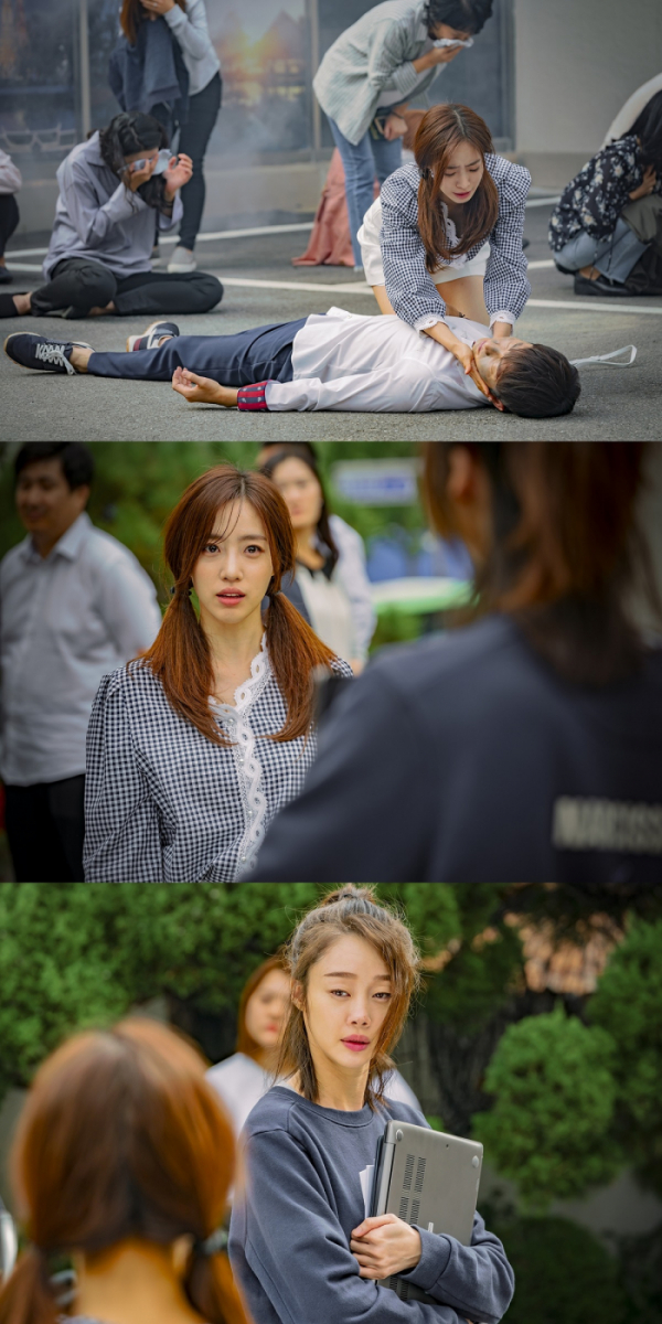 이어진 사진 속 윤아는 노트북과 대본을 소중히 끌어안은 채 대피한 은영과 의미심장한 눈빛을 주고받고 있다. 윤아는 마치 범죄 현장을 들킨 것처럼 놀란 눈으로 은영을 바라보고, 은영은 어딘지 기묘한 눈빛으로 윤아를 응시하고 있어 두 사람이 화재사건과 관해 알고 있는 비밀에 관심이 쏠린다.