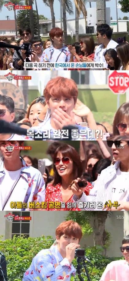 이날 신애라는 멤버들에게 LA의 분위기를 느끼게 해주기 위해 고등학교로 향했다. 학교 분위기를 물씬 느끼던 멤버들은 버스킹을 하고 있는 밴드를 향해 갔다. 버스킹 공연 중 노래를 부르고 있는 남성은 "마지막 곡은 한국 노래다"라며 딘의 '인스타그램'을 불렀다. 이에 '집사부일체' 멤버들은 "목소리 너무 좋다" "발음이 진짜 좋다"라고 놀랐다. 특히 육성재는 "가운데 한국 사람 같다"며 신기해했다.