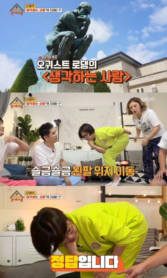 첫 문제는 오귀스트 로댕의 작품 '생각하는 사람'의 자세를 재현하는 것. 그러나 멤버들은 생각하는 사람을 쉽게 생각해내지 못해 여러가지 자세에 도전해 폭소하게 했다. 오랜 시간 동안 수많은 포즈를 시도한 끝에 멤버들은 오른손으로 턱을 괴고 다리를 꼬는 자세까지 완성했다. 그러나 왼손의 위치를 알지 못해 헤매던 가운데, 송은이가 겨우 정답을 맞췄다. 김용만은 "정답을 맞혔는데 크게 기쁘지 않다"고 씁쓸한 모습을 보여 웃음을 안겼고, 제작진이 "첫 문제 푸는 데 40분이 걸렸다"고 덧붙여 또 한번 폭소가 터졌다.