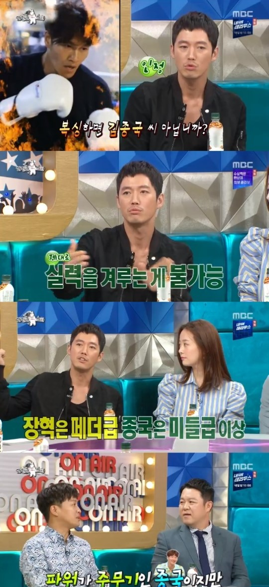 이날 방송에서는 MBC 드라마 '배드파파'의 장혁·손여은·하준·김재경·최기섭이 출연했다. "김종국과 대결하면 누가 이길 것 같냐"라는 MC의 질문에 장혁은 "일단 체급이 달라서 제대로 실력을 겨루는 것이 불가능하다. 거의 10kg 정도 차이 난다"고 말했다.