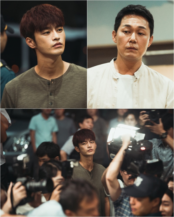 공개된 사진 속 김무영과 유진국은 경찰서 앞에서 대면하는 모습이 담겼다. 유진국은 여대생 투신자살 사건으로 체포된 살인 용의자를 의미심장하게 바라보는 김무영에게 눈을 떼지 않고 있다.