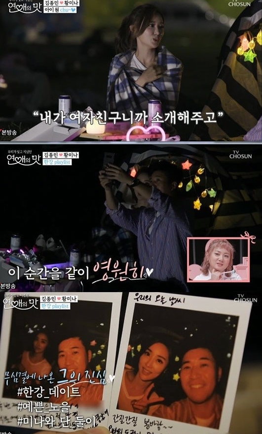 황미나는 7일 방송된 TV조선 '연애의 맛'에서 김종민과의 게임 대결에서 승리했고, 소원을 획득했다. 황미나의 소원은 "오빠 친구들 만나서 내 여자친구라고 소개하라" "퇴근 때 데리러 와라" "하나는 나중에"라고 말해 눈길을 끌었다.