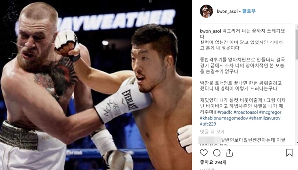 권아솔은 7일 자신의 인스타그램에 "맥그리거 너는 끝까지 쓰레기였다. 실력이 없는 건 이미 알고 있었지만 기대하고 본 게 내 잘못이다"라고 비난했다. 이어 "종합격투기를 양아치 판으로 만들더니 결국 너의 양아치 적인 본 모습을 숨길 수가 없구나. 백만 불 토너먼트 끝나면 한번 싸워주려고 했더니 네 실력이 이렇게 드러나는구나"라고 덧붙였다.