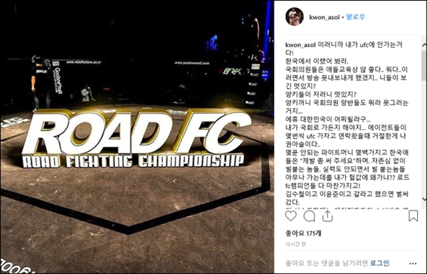 권아솔은 "에이전트들이 몇 번씩 UFC 가자고 연락 왔을 때 거절한 게 나 권아솔이다. 몇 푼 안 되는 파이트머니 몇백 가지고 한국 애들은 '제발 좀 써 주세요'하며 자존심 없이 빌붙는 놈들"이라며 "실력도 안 되면서 빌붙는 놈들 아무나 가는 데를 내가 헐값에 왜 가냐? 로드FC 챔피언들 다 마찬가지고"라고 글을 이었다.