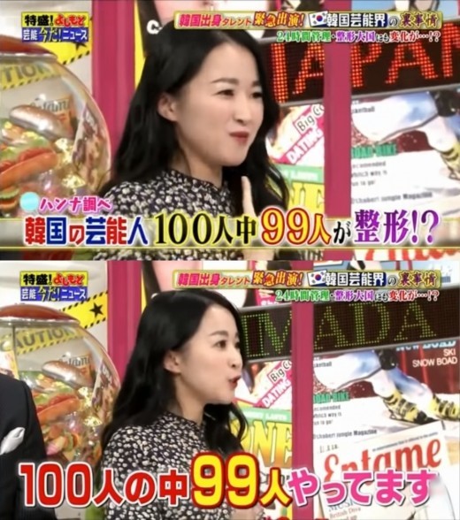 강한나는 27일 일본 요미우리TV '도쿠모리 요시모토'에서 "한국에서는 연예인뿐 아니라 일반인 사이에서도 성형이 성행하고 있다. 내가 알기로는 한국 연예인 100명 중 99명이 성형을 한다"라고 말했다.